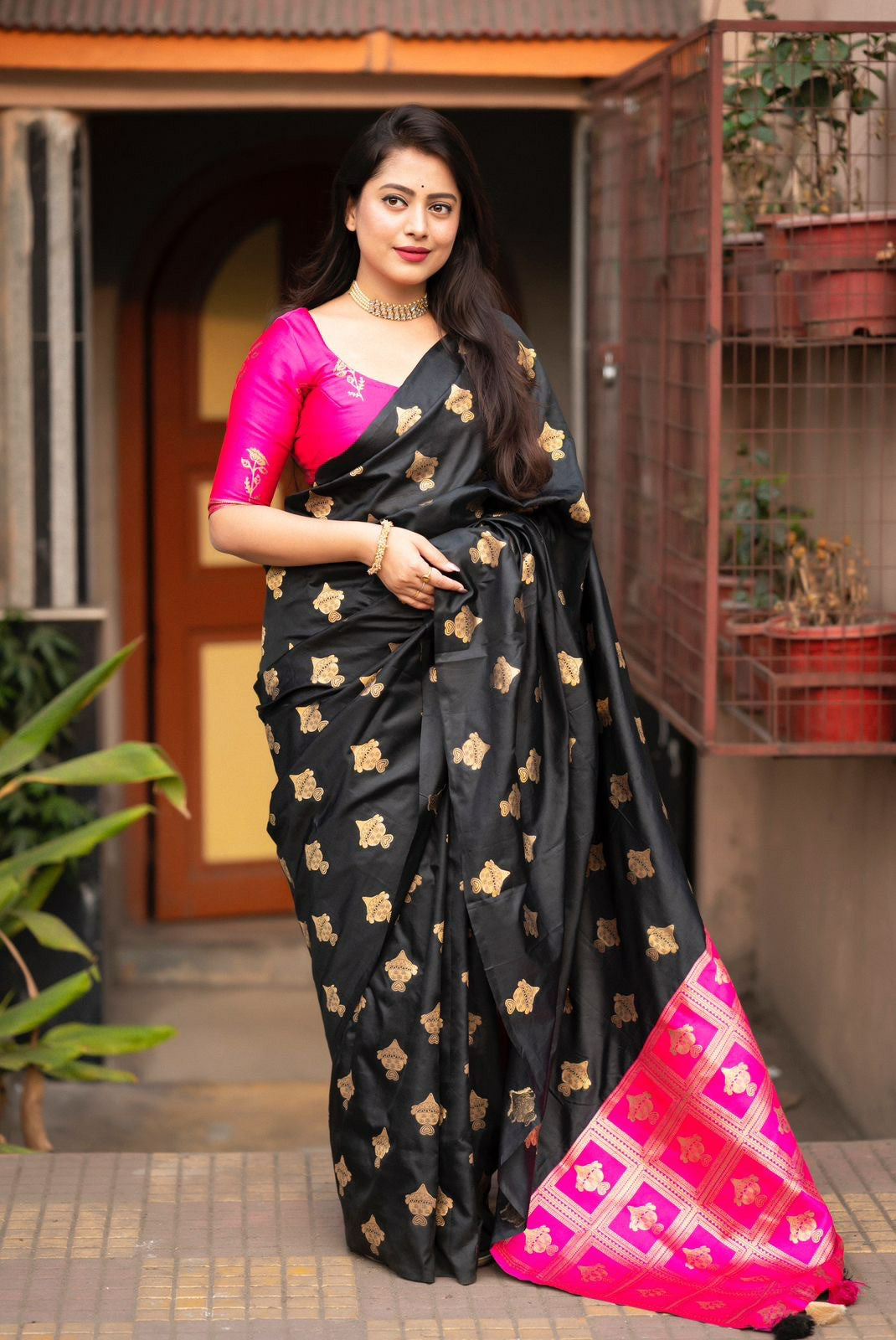 Black Zari Silk Saree with Vibrant Pink Pallu
