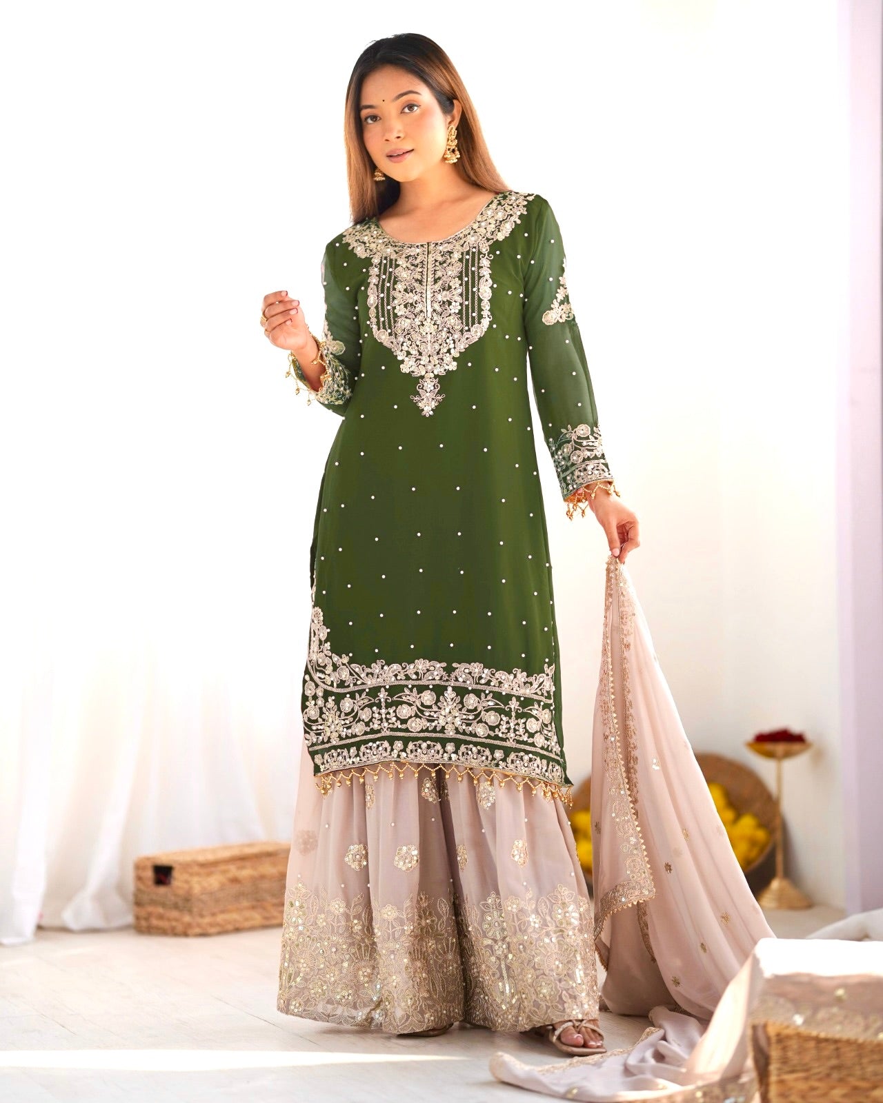 *Dupatta Fabric* :Heavy Faux Georgette With Embroidery Coding Dori-Sequence Work With Rivet Moti Woro And Lace Border
