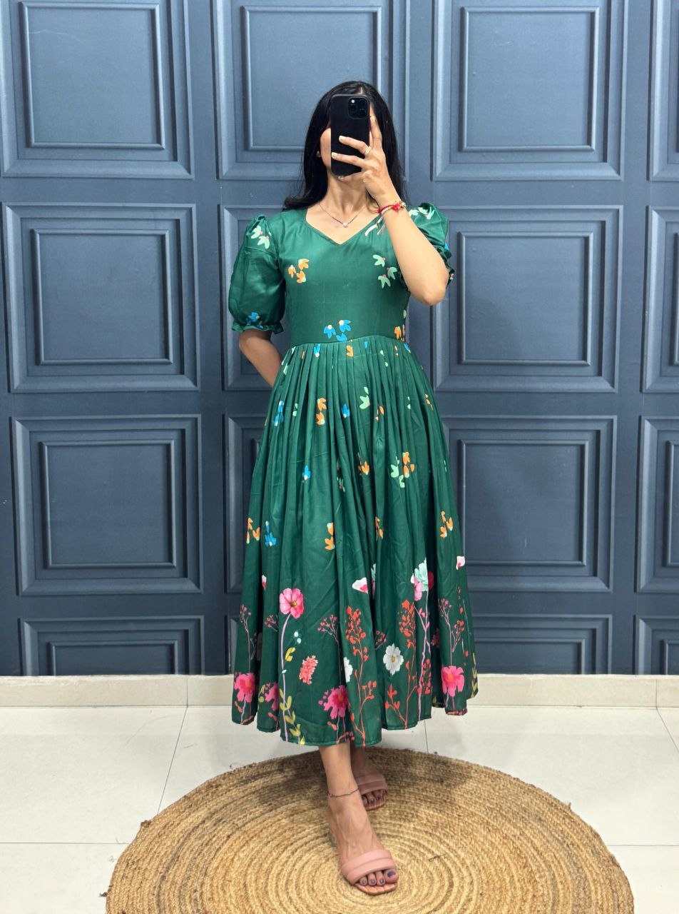 Green A-Line Fit and Flare Dress with Colorful Floral Print